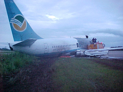 The aircraft, on a flight from Belém and Manaus, crash-landed short of runway 06 at Rio Branco in poor weather conditions. On its landing in pre-dawn darkness and heavy fog, the aircraft then veered off the side of the runway where it presumably lost its entire undercarriage before colliding with trees and coming to rest